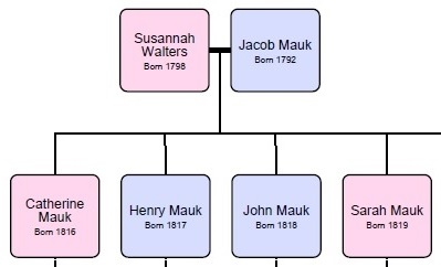 Jacob Mauk and his wife, Susannah Walters (or Walter), were married in the 1810s and had 16 children who lived to adulthood. All sixteen married, had children and have living descendants. An ‘official’ list of these descendants is maintained at Jacob & Susannah Walters Mauk Family. (This is a Tribal Pages website, information on living descendants is password protected.)